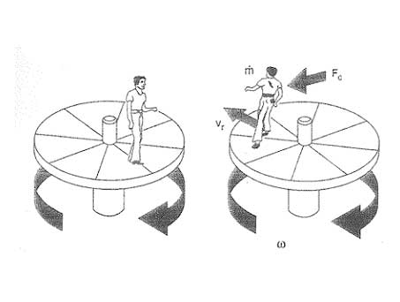 A person still on a rotating circular platform halfway between center and edge simply knock your weight slightly inward to counter the centrifugal force (left). However, if the person moves from center to the edge of the turntable, as it moves seen an increase in speed and the Coriolis force appears as a reaction to the forces of inertia. The Coriolis force tends to deflect the person of the shortest path on the turntable (ie, the straight line on the radius of the circular platform). The higher the speed of the platform, the greater the weight ofthe person and increased your speed to the edge of the circular platform (the "mass flow"), the greater the effect of inertia and the effect will be perceived more Coriolis force.